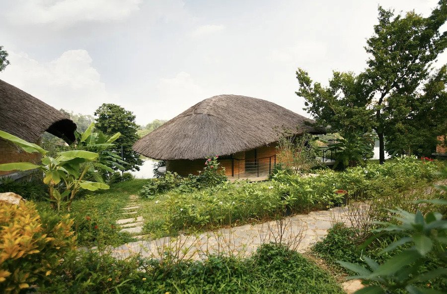 Mọi không gian đều có sự xuất hiện của cây xanh và mặt nước. Mặt nước đóng vai trò hồ điều hoà, đối lưu không khí. Khu nhà ở kết hợp homestay với nhiều loại hình nhà, mỗi nhà là một trải nghiệm thú vị, toàn bộ vật liệu bao che công trình sử dụng gạch đất không nung, mái lá xoè rộng giảm tối đa bức xạ nhiệt.