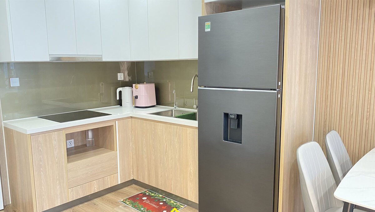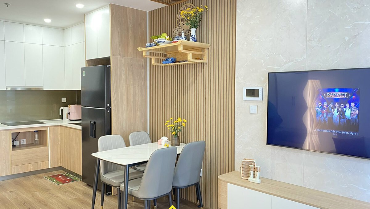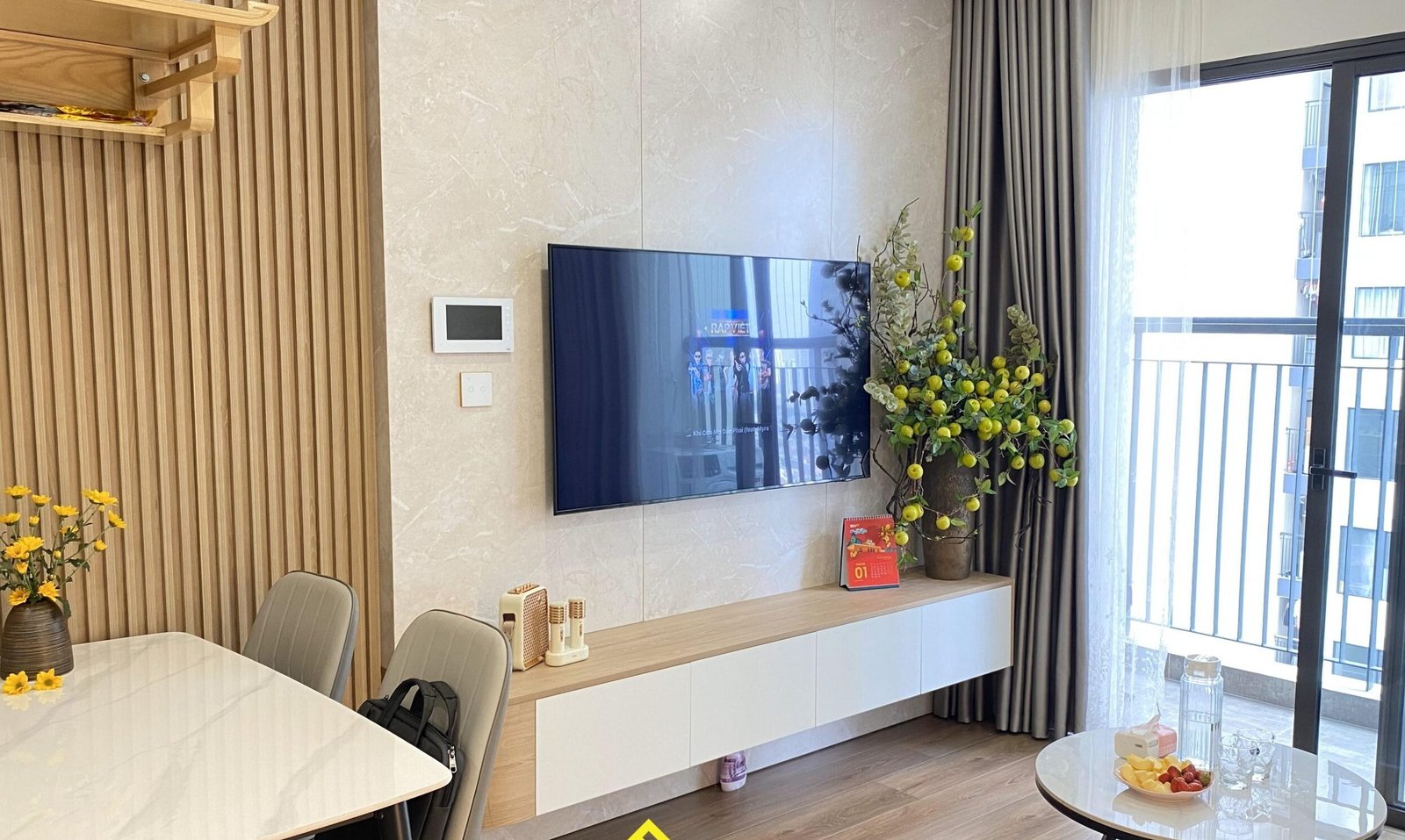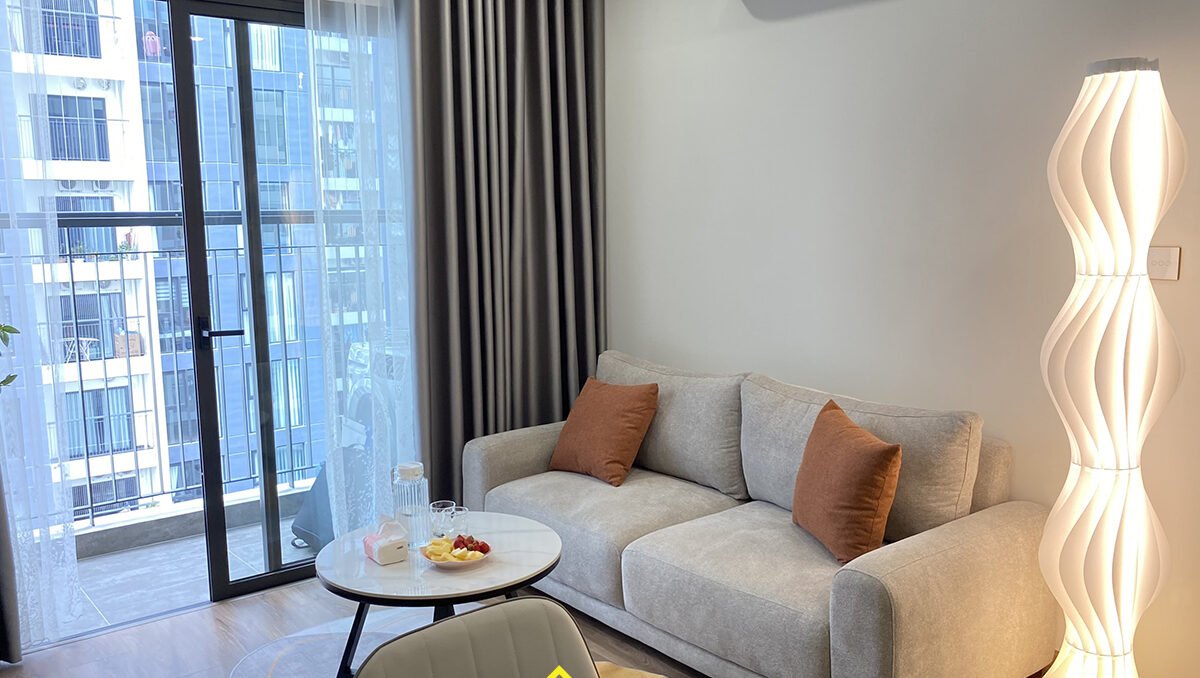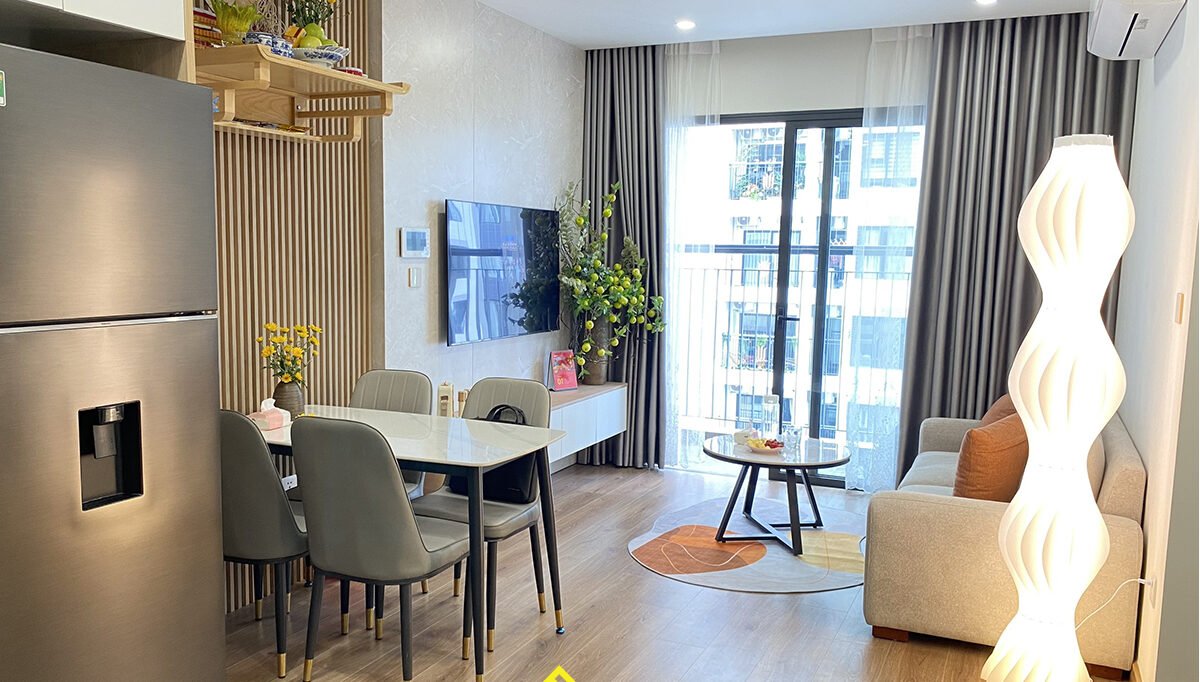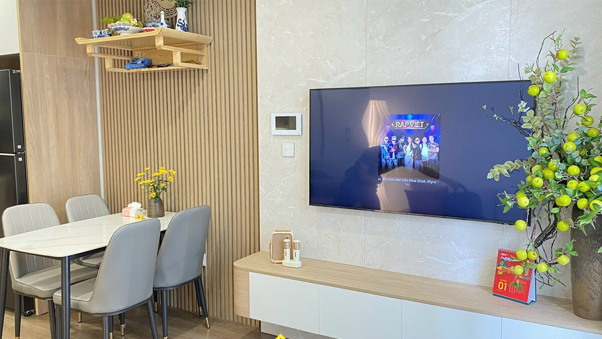 Phòng khách của căn hộ này được thiết kế mở, kết nối trực tiếp với ban công lớn, giúp không gian luôn ngập tràn ánh sáng tự nhiên. Bộ sofa xám nhã nhặn kết hợp cùng đèn đứng nghệ thuật và bàn trà nhỏ gọn mang đến cảm giác ấm áp nhưng vẫn hiện đại. Kệ tivi tối giản cùng mảng tường vân đá nhẹ nhàng tạo sự cao cấp và tinh tế cho căn hộ.