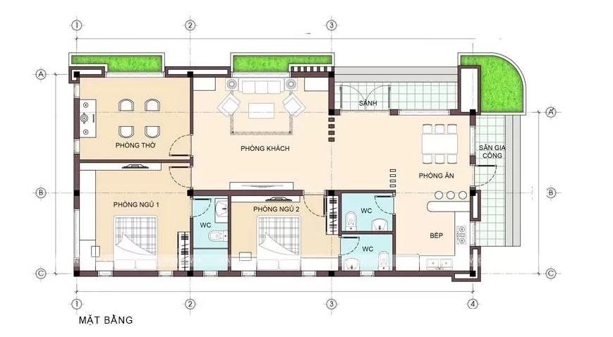 Mặt bằng công năng ngôi nhà bao gồm: Phòng khách, bếp + phòng ăn, 1 phòng thờ, 2 phòng ngủ và 1 phòng vệ sinh. Phương án bố trí nội thất, phân chia diện tích hợp lý khiến căn nhà cấp 4 diện tích không lớn nhưng vẫn bảo đảm công năng, thẩm mỹ.