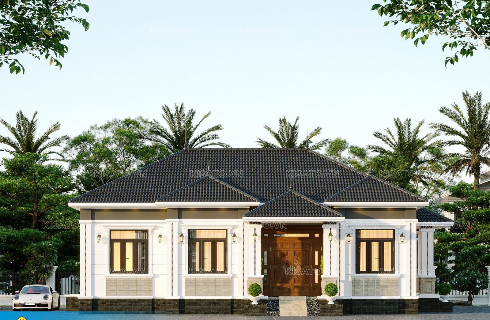 Ngôi nhà với lớp sơn màu trắng làm chủ đạo, hệ mái Nhật truyền thống với hệ mái khung kèo thép nhẹ, ngói lợp mái romantisc. Khoảng sân rộng rãi được lát những gạch đá xanh Thanh Hóa. Phía dưới những ô cửa sổ được ốp gạch đá màu trắng sữa tô thêm với lớp sơn màu trắng của ngôi nhà. Chân tường được ốp gạch màu đen để giảm sự rêu mốc bám quanh.