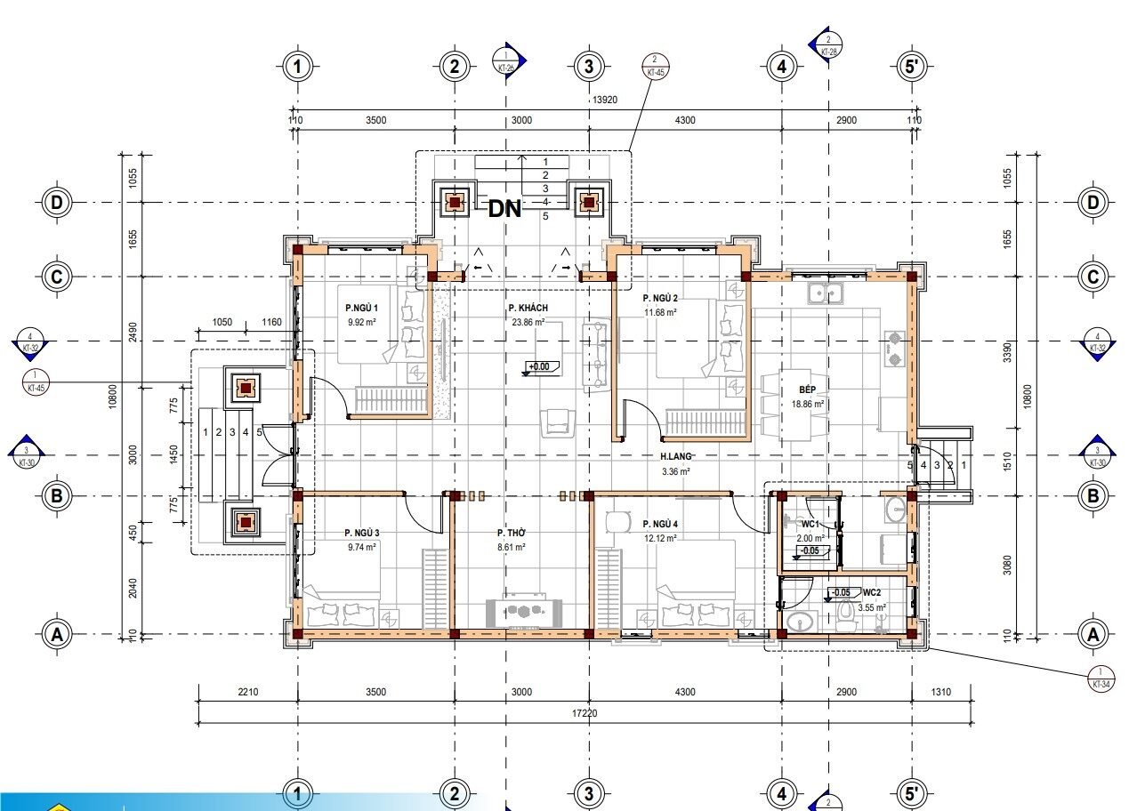 Nhà cấp 4 mái Nhật với diện tích 17.2*10.8m, gồm 1 phòng thờ, 1 phòng khách, 1 phòng bếp và 4 phòng ngủ, trong đó có 1 phòng ngủ khép kín và 1 nhà vệ sinh để tiện sinh hoạt hơn. Nhà cấp 4 được chúng tôi thiết kế với 2 sảnh chính cho gia chủ, với thiết kế như thế tạo không gian gần gũi và thuận tiện cho gia đình anh Hạnh hơn. Thiết kế mỗi phòng đều có cửa sổ thông thoáng ra phía ngoài, giúp những ánh nắng có thể tràn vào trong phòng như thế sẽ mang lại cảm giác thông thoáng cho các phòng.