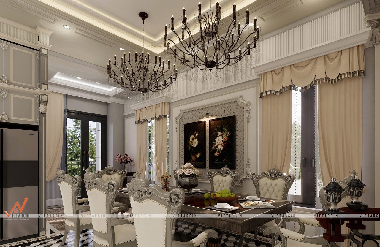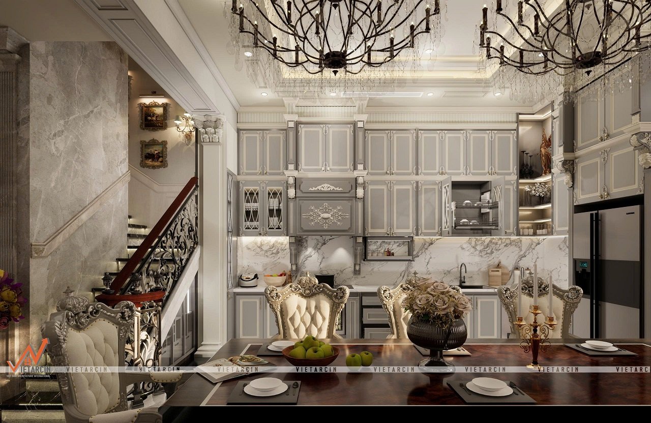 Phòng ăn được bố trí bàn ăn lớn bằng gỗ tối màu, đi kèm ghế ăn bọc nệm da màu kem với khung ghế chạm khắc tinh xảo, thể hiện sự quyền quý và thoải mái. Hệ thống tủ bếp trên và dưới được thiết kế với gam màu xám nhạt chủ đạo, kết hợp phào chỉ và tay nắm cổ điển. Tấm ốp backsplash bằng đá cẩm thạch lớn với vân đối xứng tạo vẻ sang trọng.