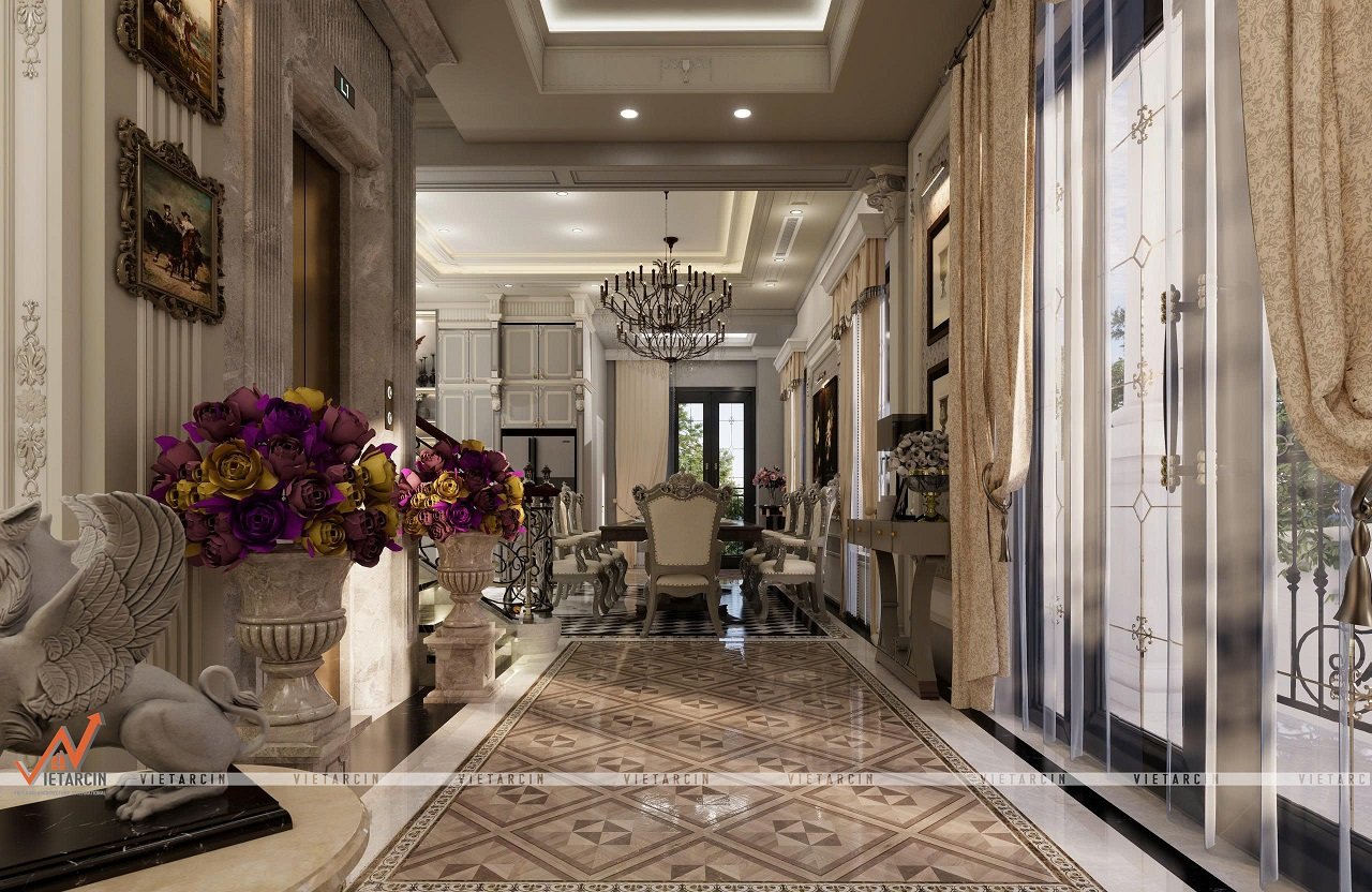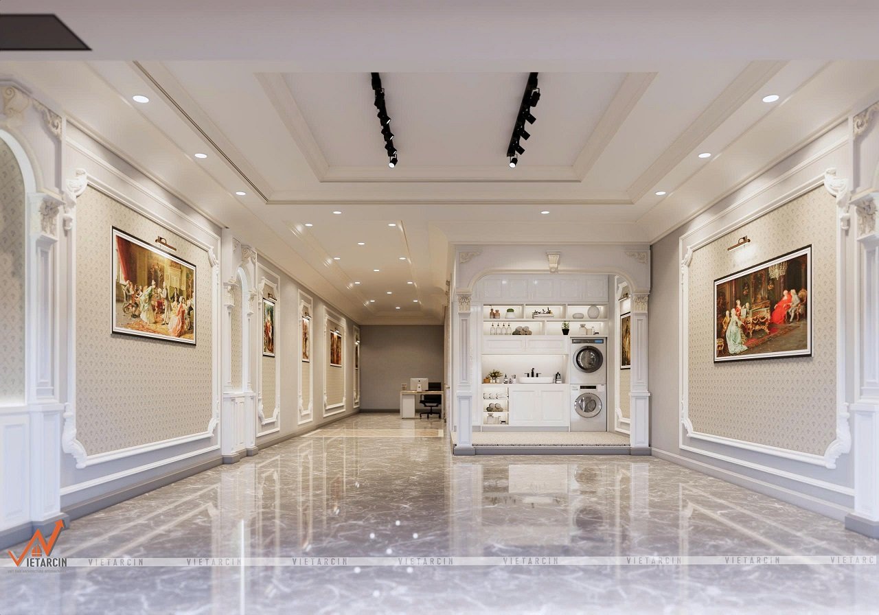 Tường và trần được xử lý bằng phào chỉ và hệ thống chiếu sáng âm trần, nhấn mạnh chiều sâu và sự tinh tế. Các cột trụ vuông vắn với chi tiết hoa văn cổ điển ở chân và đầu cột, mang đến sự vững chãi và nét kiến trúc đặc trưng.