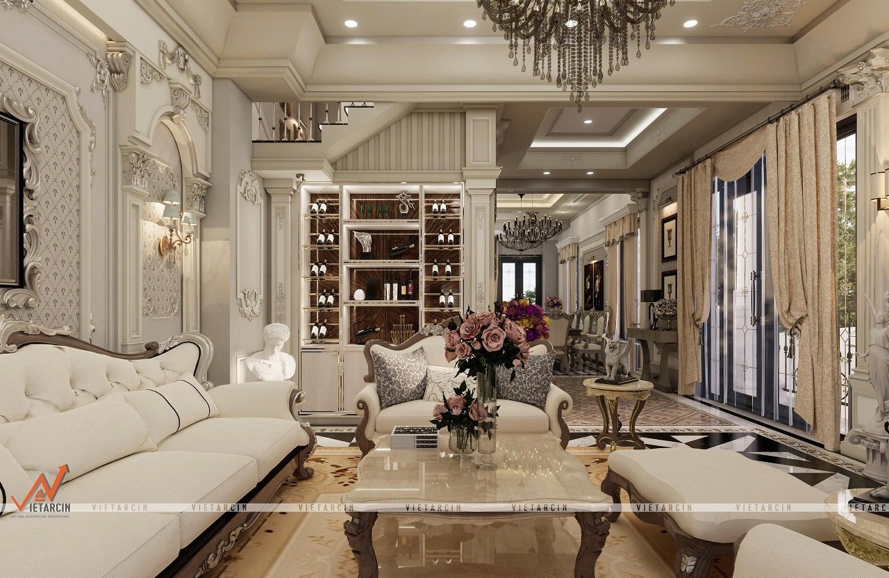 Hình ảnh này cho thấy sự liền mạch và rộng lớn của không gian phòng khách, với các chi tiết trang trí được chăm chút tỉ mỉ. Hệ thống tủ kệ trưng bày rượu và vật phẩm trang trí được thiết kế âm tường, vừa tiết kiệm diện tích vừa tạo điểm nhấn sang trọng với đèn chiếu sáng bên trong.