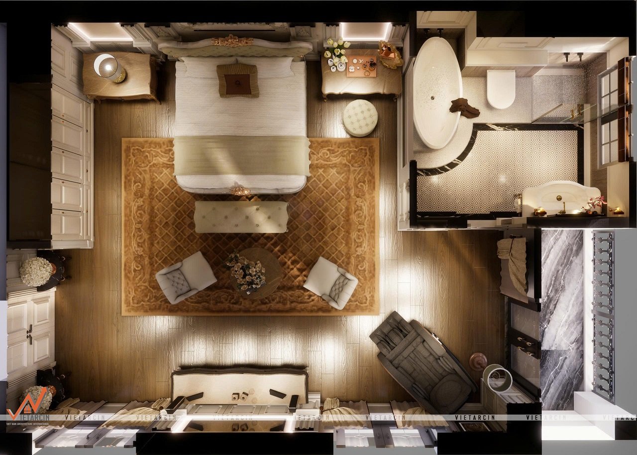 - Giường ngủ được đặt ở vị trí trung tâm, đảm bảo sự cân đối và là điểm nhấn chính. Các khu vực phụ trợ được bố trí xung quanh một cách khoa học.