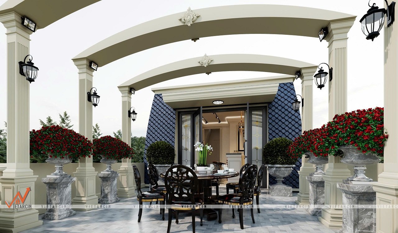 - Sân thượng được thiết kế rộng rãi với khu vực ăn uống ngoài trời, được che chắn bởi hệ thống mái vòm và cột trụ kiên cố.